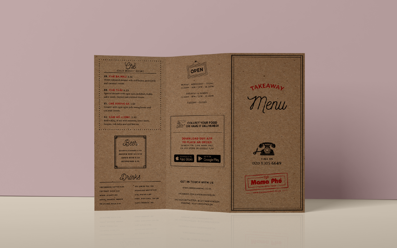 Café Mama Pho is a family owned Vietnamese restaurant. They asked us for a new menu design to go with their new refurbished interior. We helped them to refresh their brand and set up social media platforms for them.