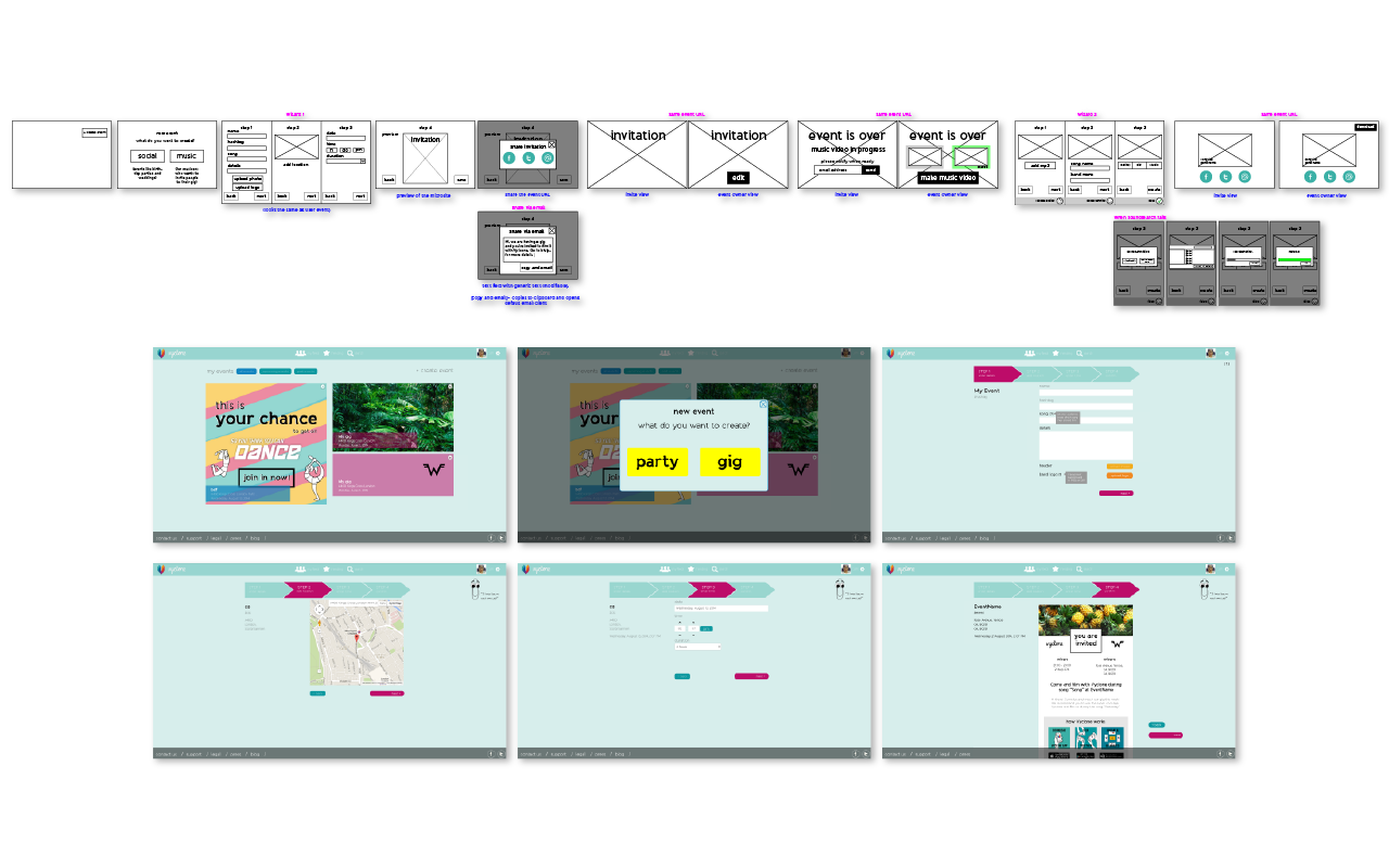 Wireframes and mockups for the event creation on the website.